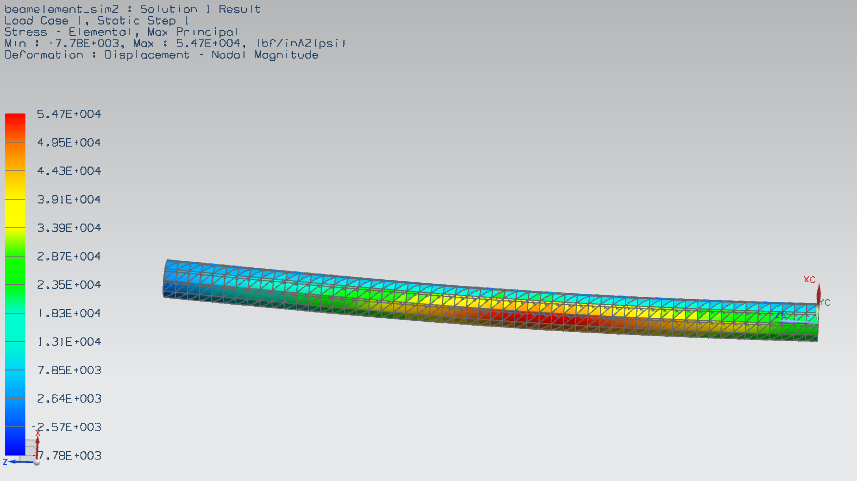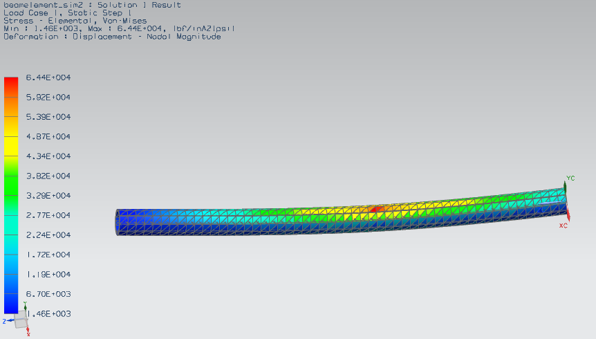 The red represents where most of the load is concentrated and how the stress is distributed along the member. The von Mises stress is much lower than the yield strength and has a safety factor of 2.86.
