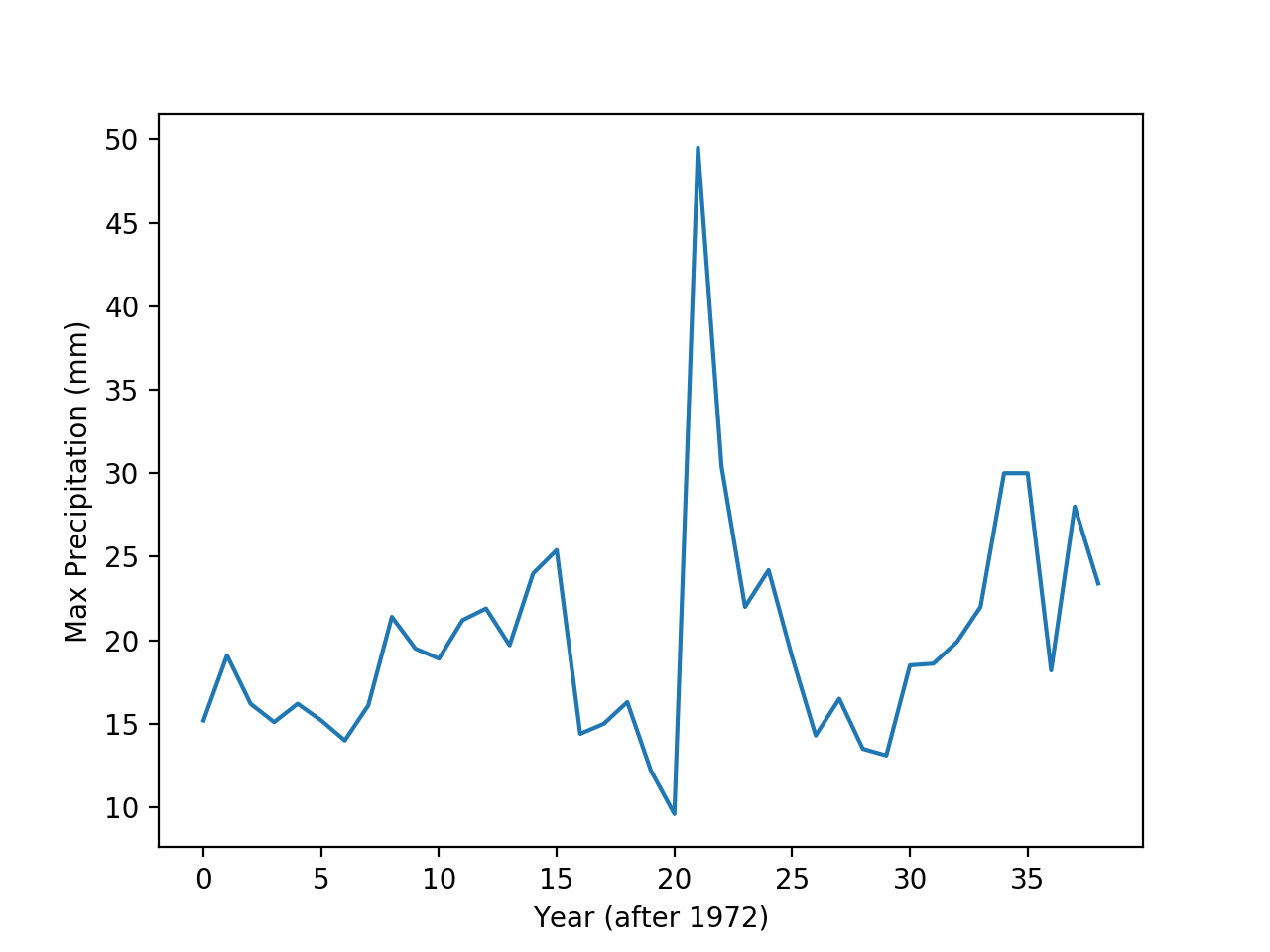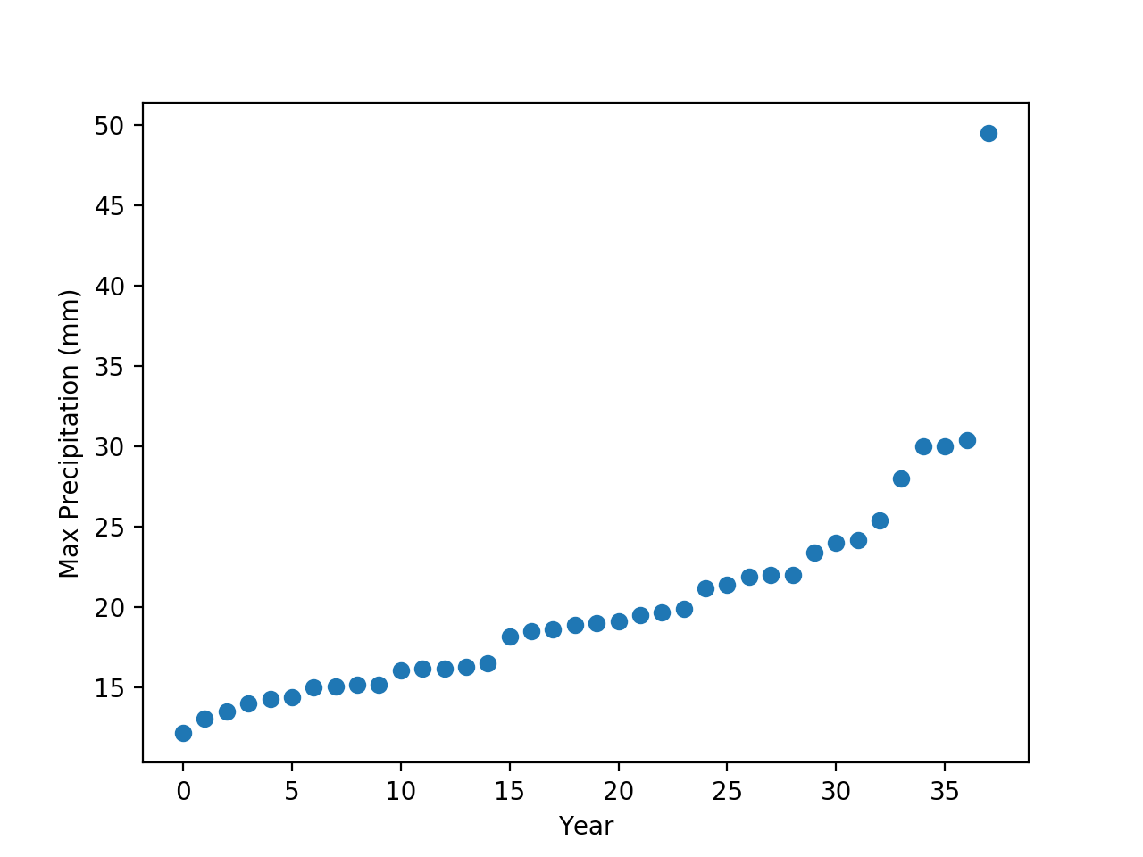 The first step was to find the maximum annual rainfall for every year available. The problem was combing through the daily data values most of which were 0mm. Once I had the maximum annual rainfall I could begin determining the normal distribution. The first thing I did was to parse the csv information. This involved importing the file, extracting the date, separating the date into year, month and date. I only really cared about the year. Once these were separated, it was simple to determine the yearly maximum, and create a new csv with only the annual maximum. The new graph is below:
