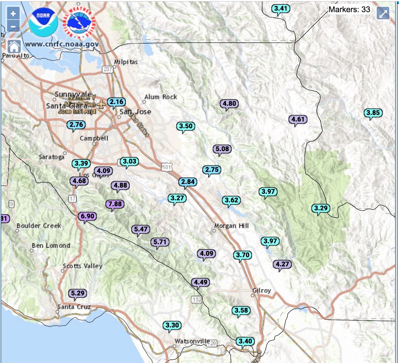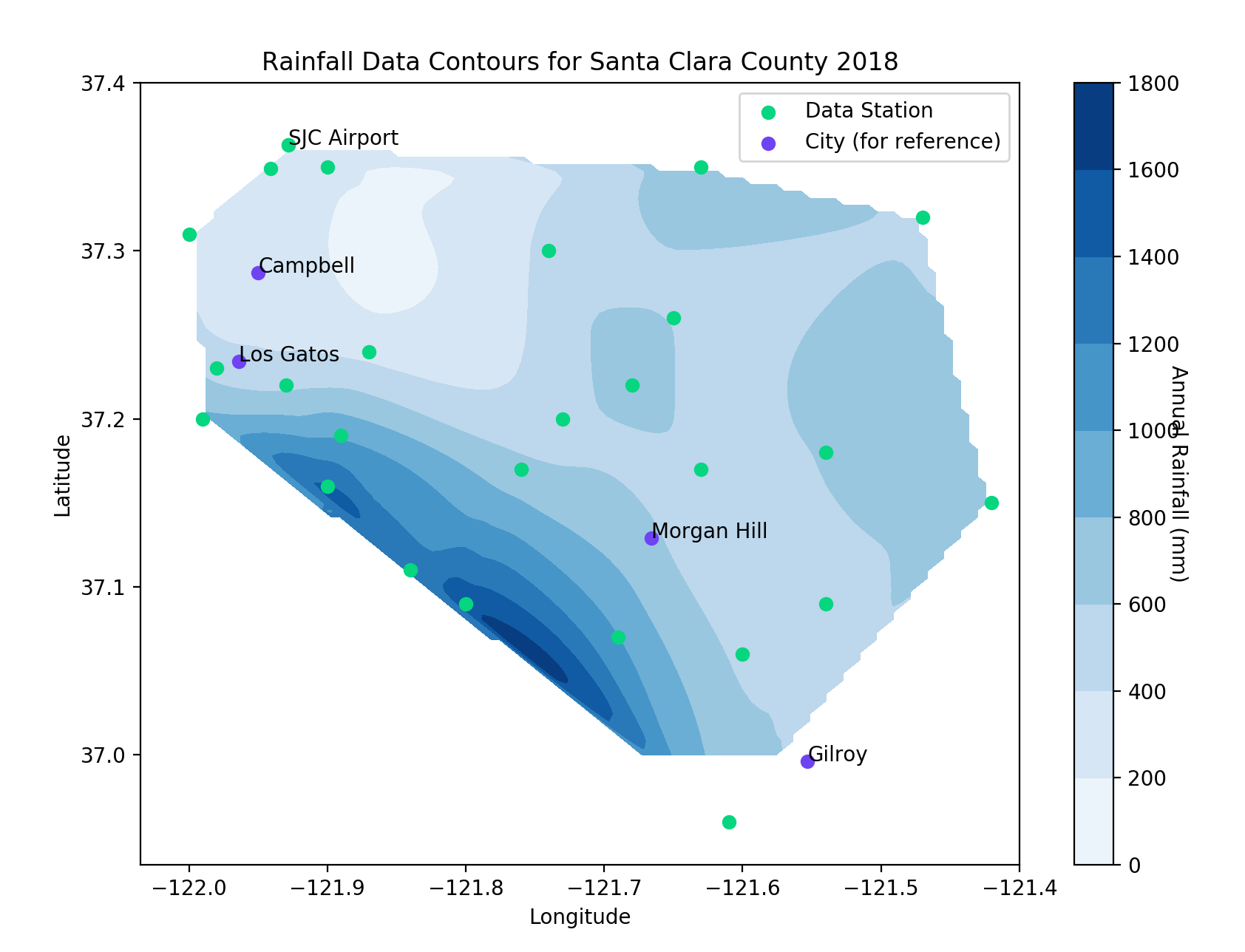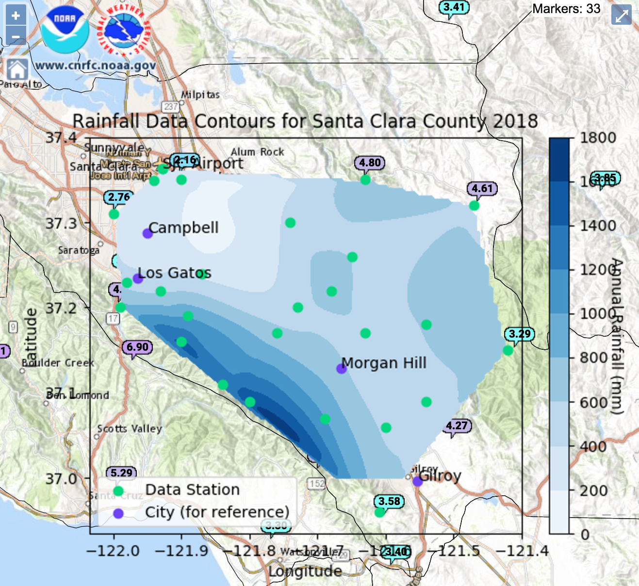 I wanted to recreate this project using weather data from Santa Clara County. Above are the locations of the stations with the most recent monthly rainfall in inches. I used the NOAA website to find the data for the total yearly rainfall, extracted only the stations in Santa Clara County, and created a contour map. The figure is below: