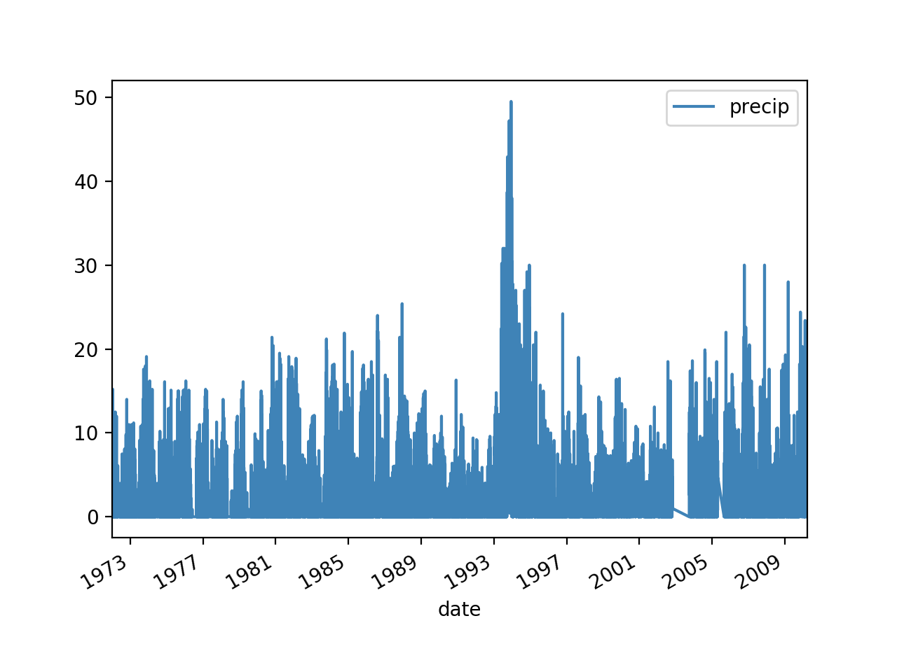 I have always loved working with numbers and I have always been fascinated with hydrology. This project started as an opportunity to combine these two interests (plus it allowed me to improve my Python skills!). I started with some rainfall data in a csv file. It contained almost daily rainfall numbers over a period of 40 years. I started with almost 15,000 data points, and I wanted to see if I could clean the data up a bit.